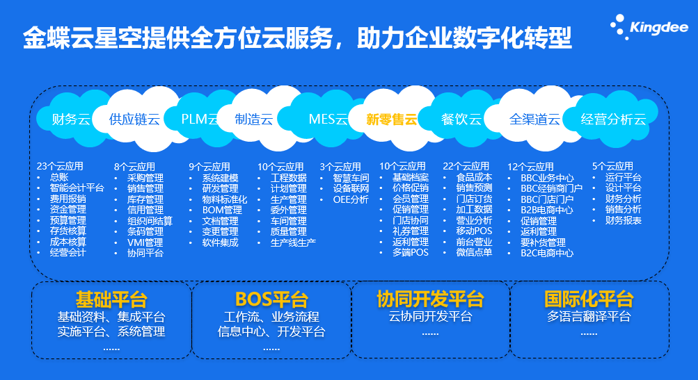 金蝶云·星空秉持流程驅(qū)動與角色驅(qū)動思想,通過數(shù)據(jù)和智能助力高成長型企業(yè)韌性成長,幫助企業(yè)從ERP資源計劃力向,EBC數(shù)字戰(zhàn)斗力轉(zhuǎn)變,實現(xiàn)數(shù)字化轉(zhuǎn)型以及管理重構(gòu)。